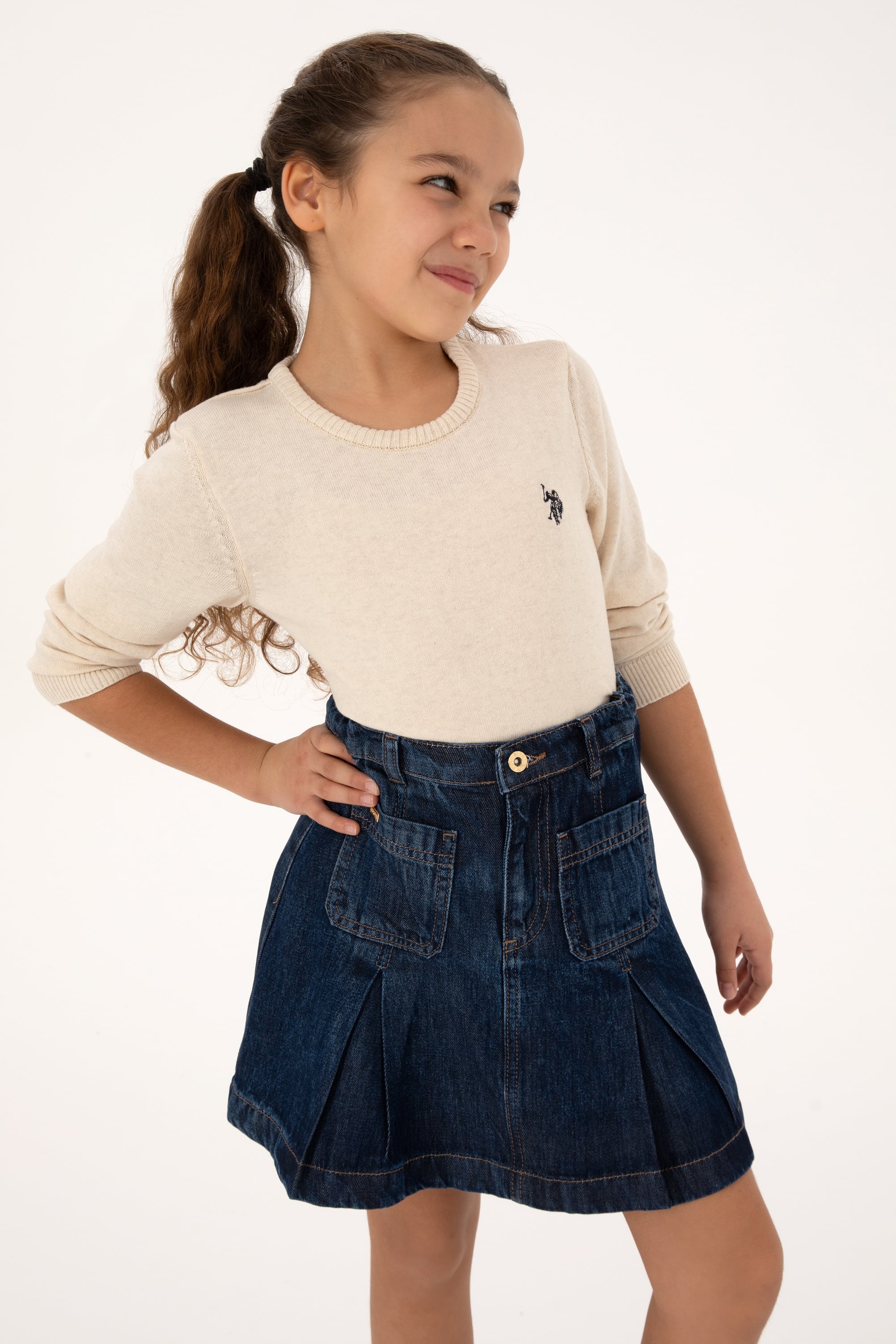 Kız Çocuk Krem Melanj Bisiklet Yaka Basic Kazak