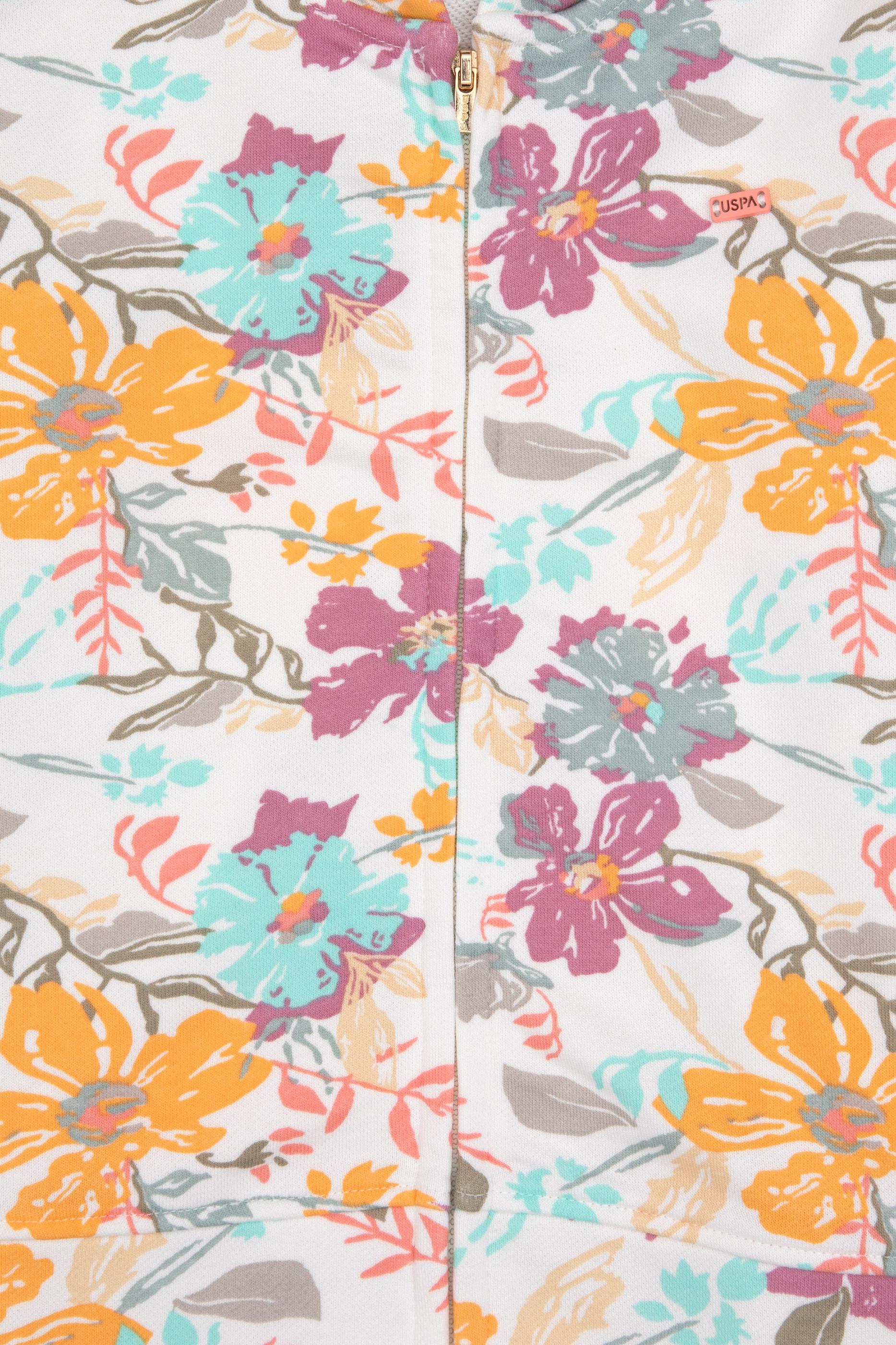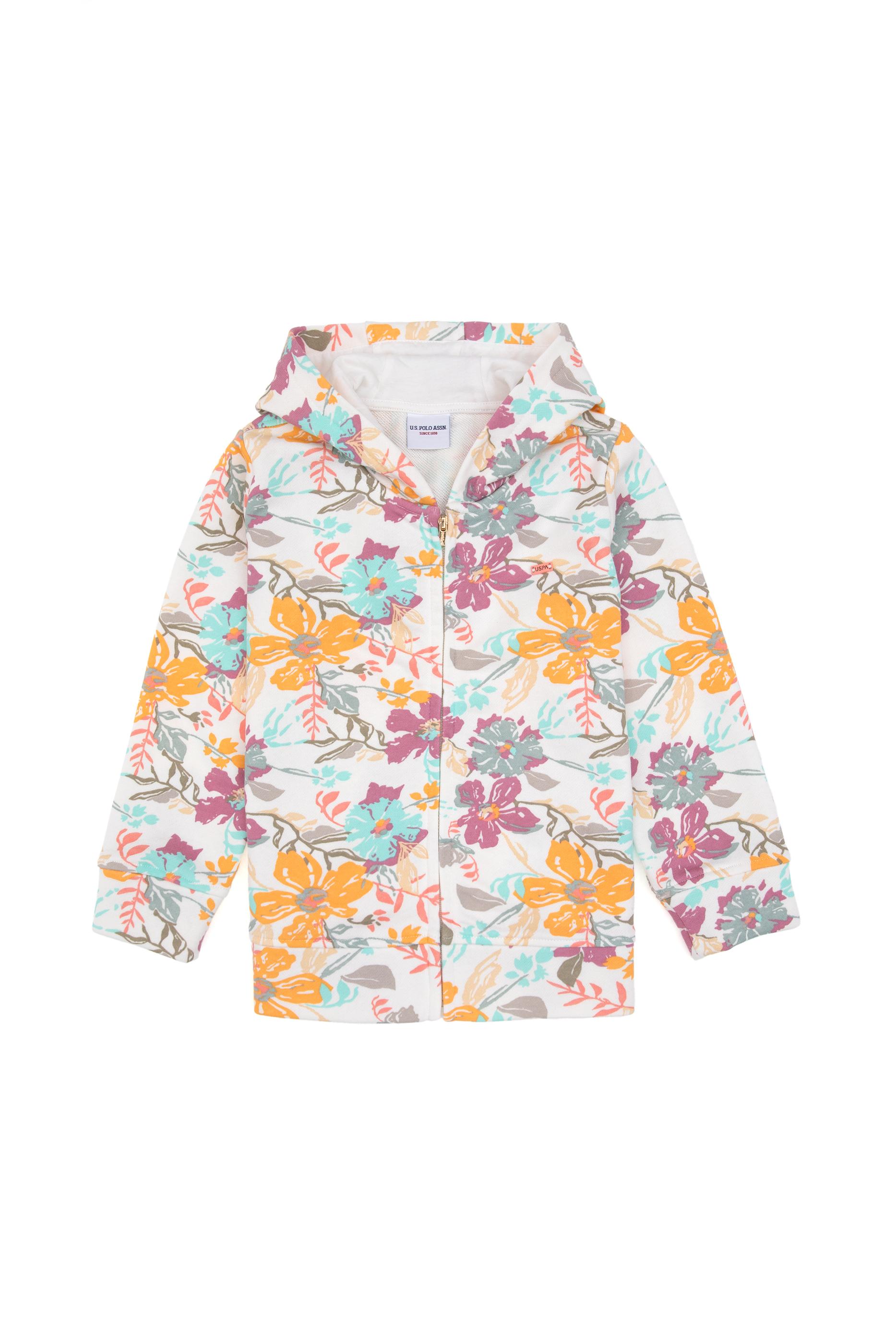 - Kız Çocuk Krem Çiçek Baskılı Kapüşonlu Fermuarlı Sweatshirt