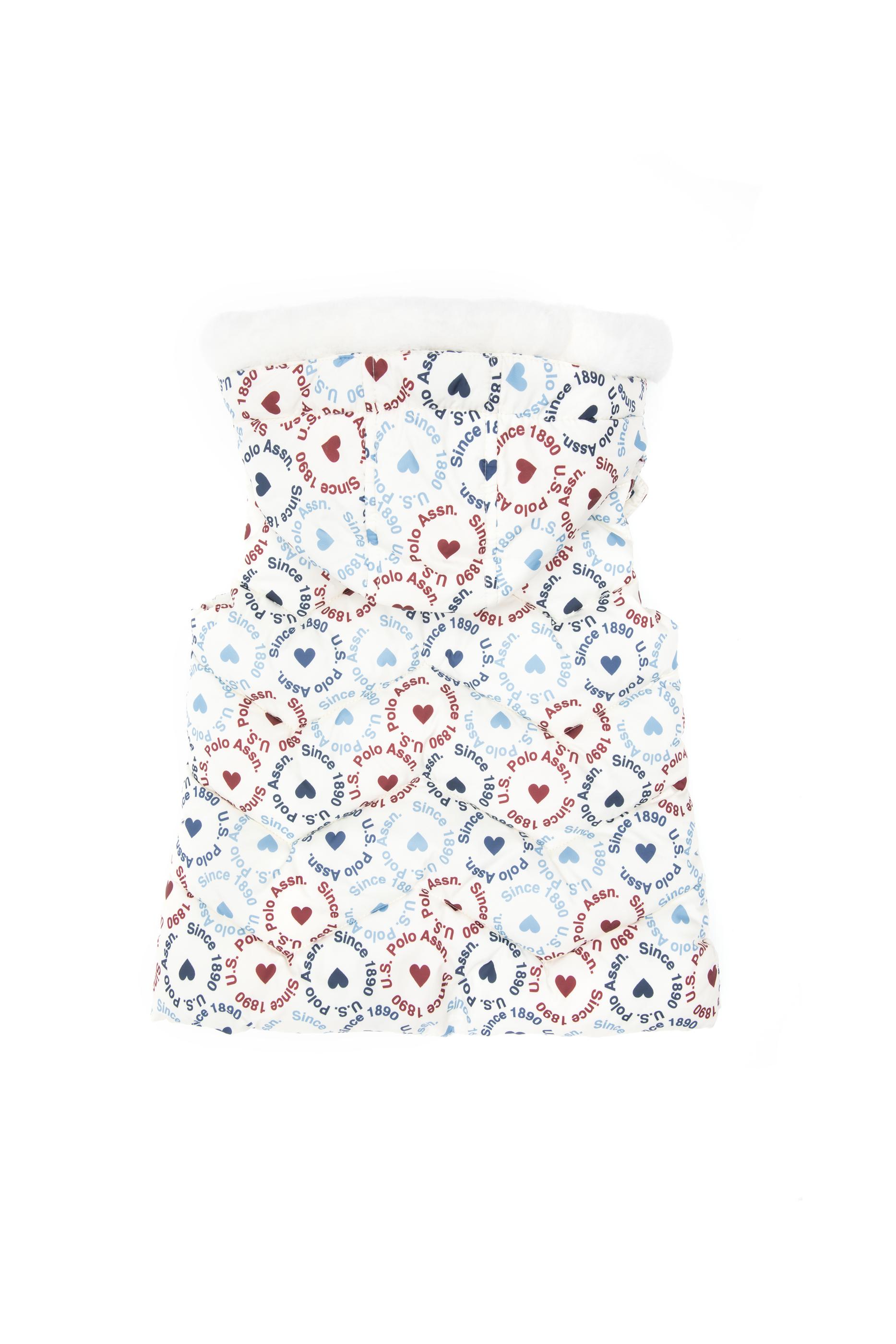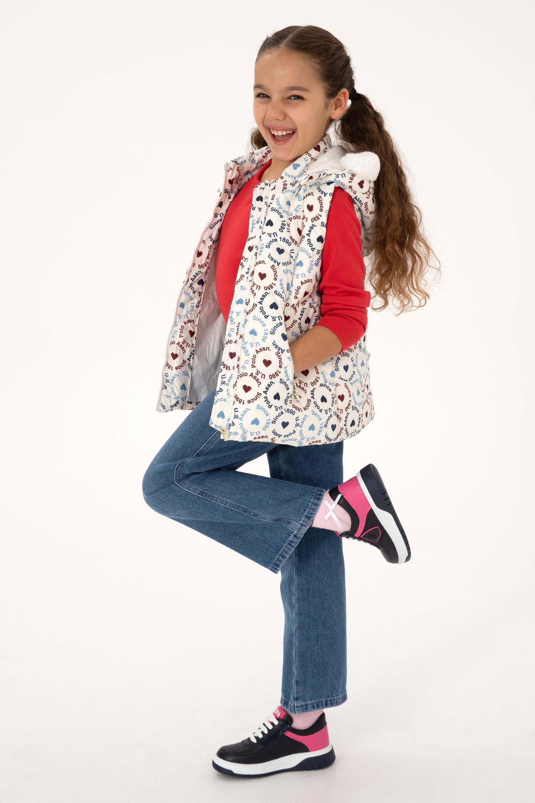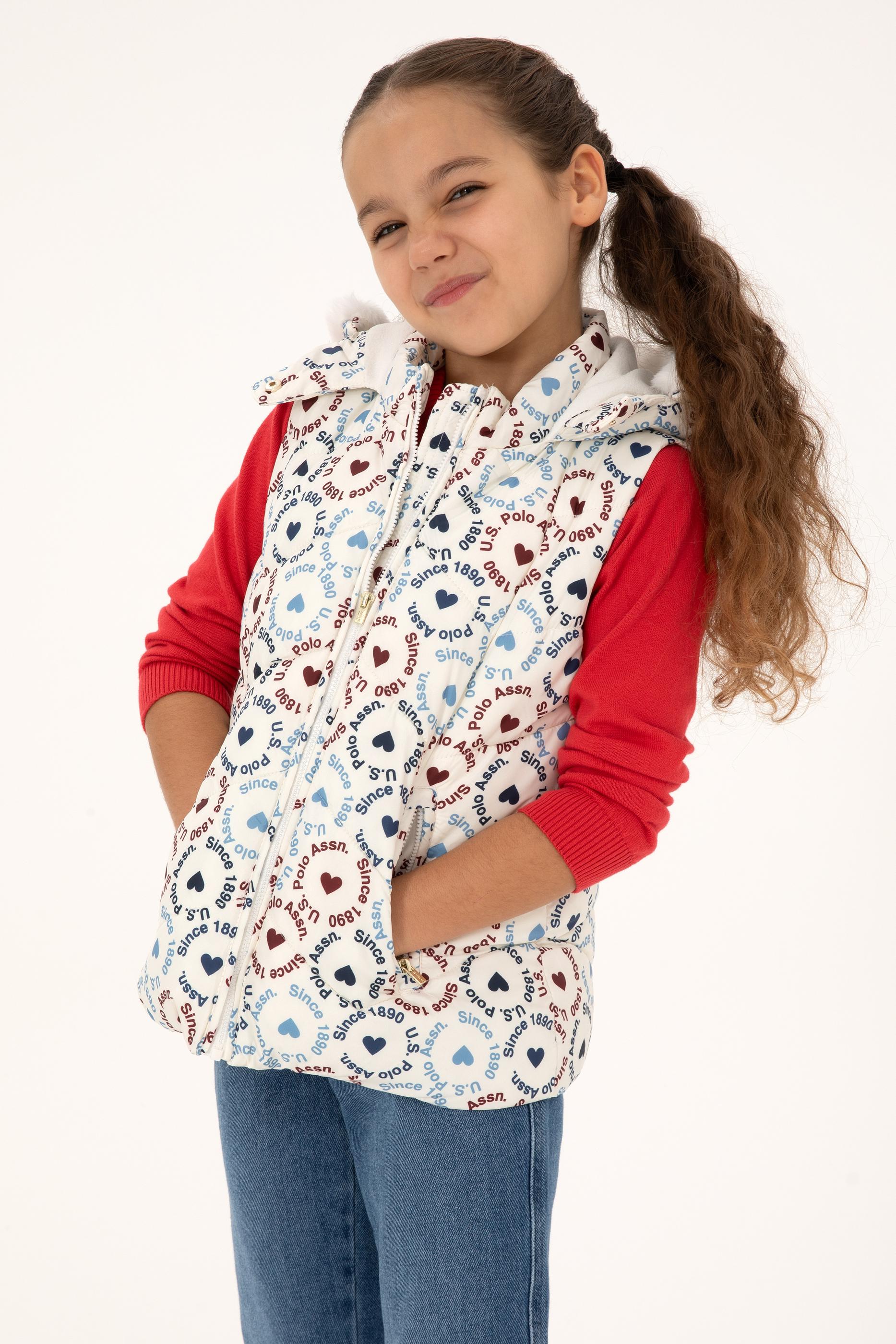 Kız Çocuk Krem Kalp Desenli Kapüşonlu Şişme Yelek