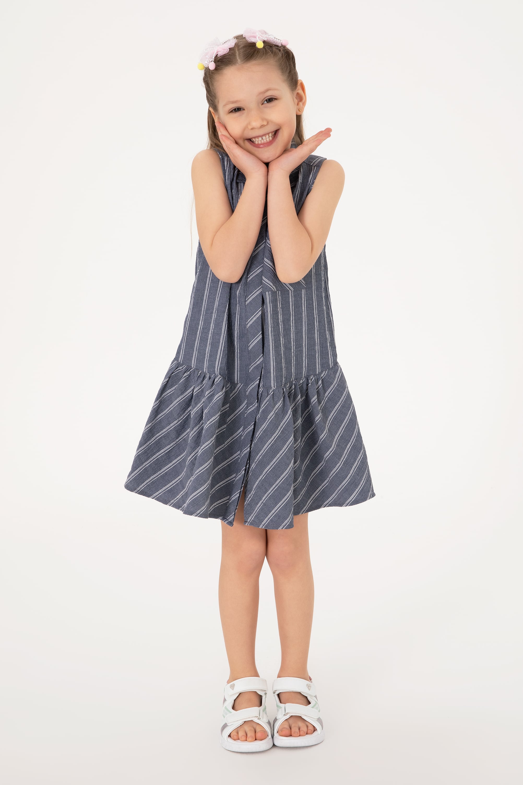 Kız Çocuk Lacivert Polo Yaka Kolsuz Çizgili Dokuma Elbise