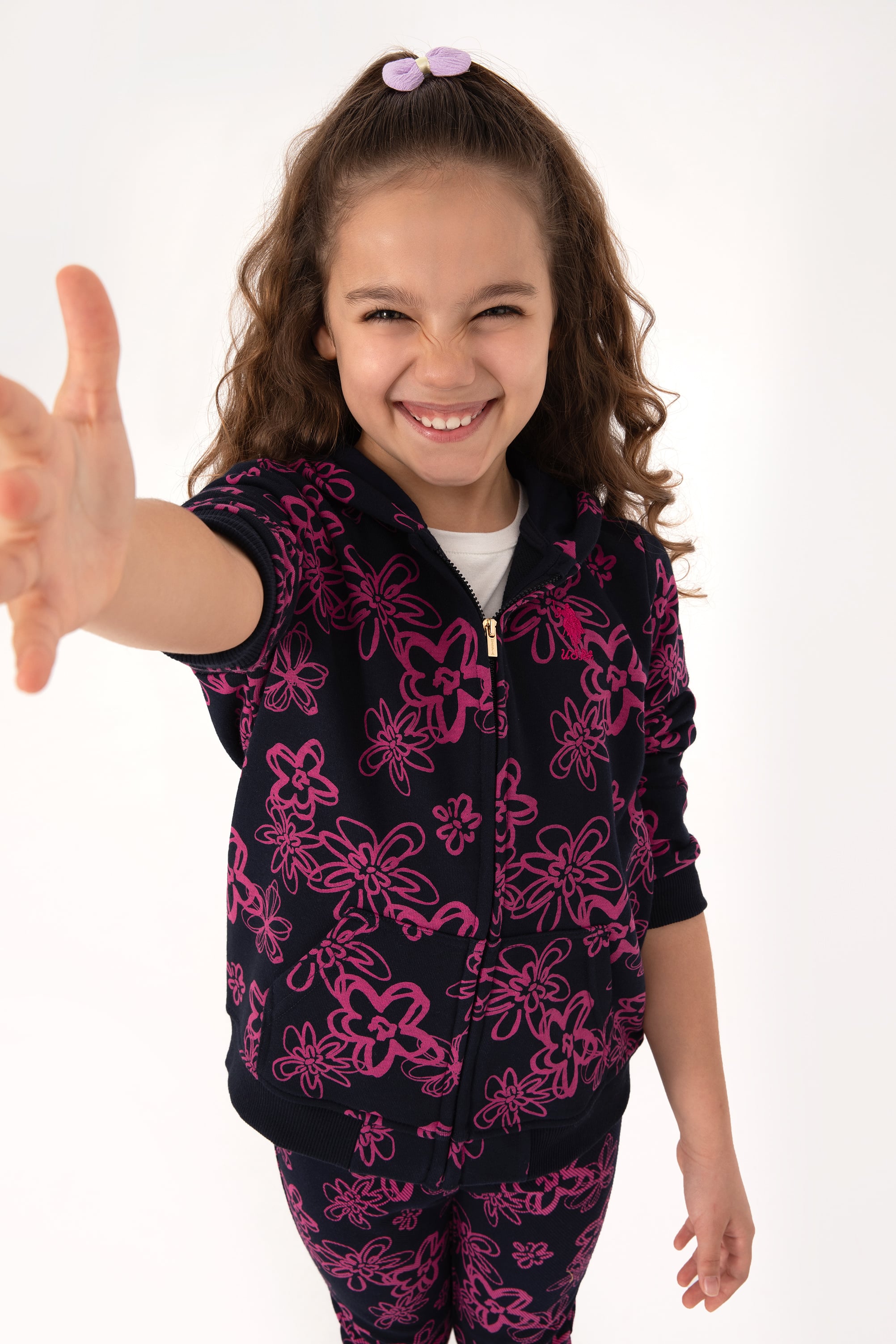 - Kız Çocuk Lacivert Kapüşonlu Fermuarlı Çiçek Desenli Sweatshirt