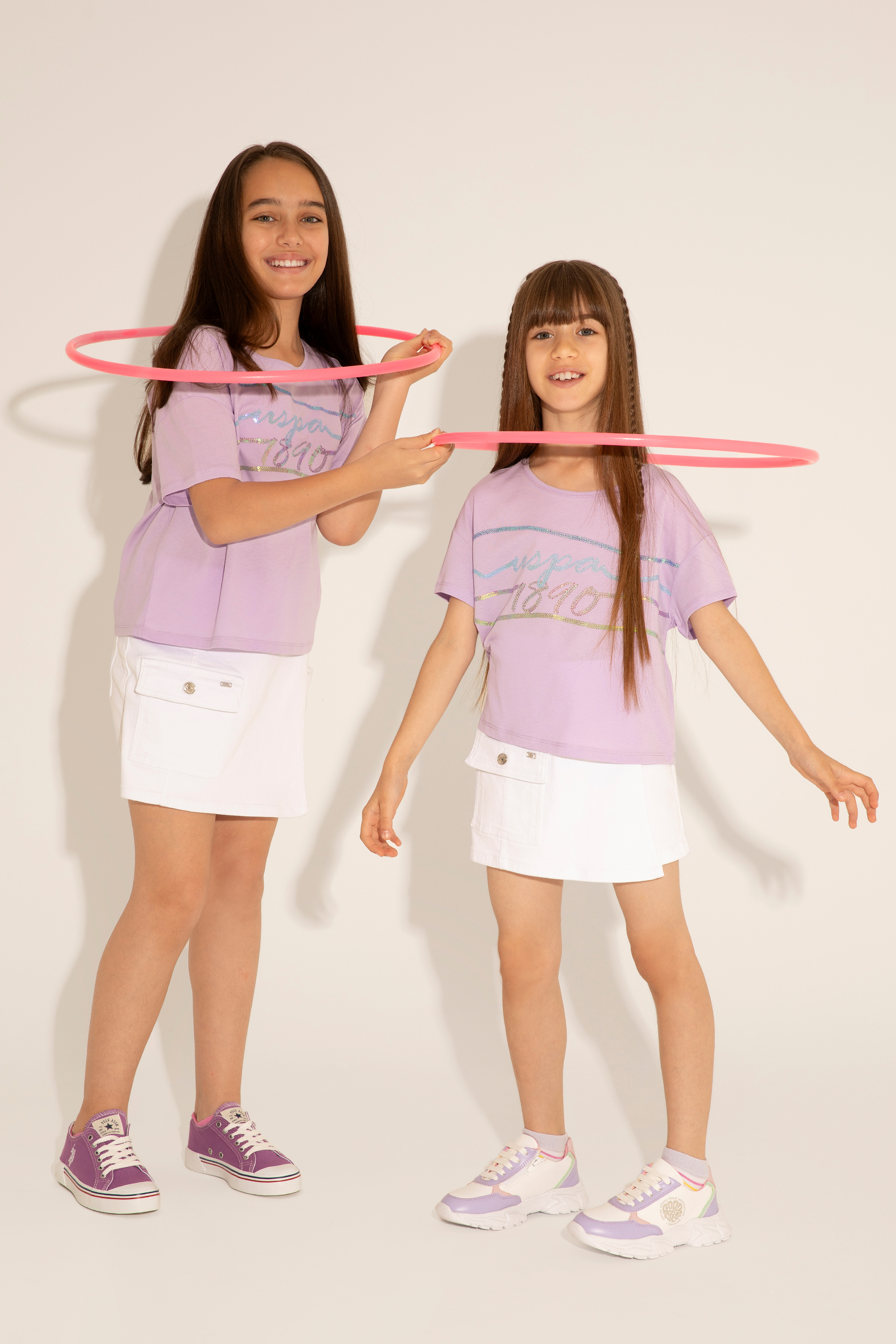Crop top modeli ile özellikle yaz aylarında serinlik sunan lila basic tişört, çocukların enerjik ve hareketli yapısına tam uyum sağlar. Üzerindeki baskısı, tişörte modern ve dinamik bir hava katarak günlük kombinlerde öne çıkmasını sağlar. Lila renginin neşesi, çocukların stiline tatlı bir dokunuş katarken, tişörtün sade ve şık yapısı onu hem günlük giyim hem de özel günler için uygun hale getirir.