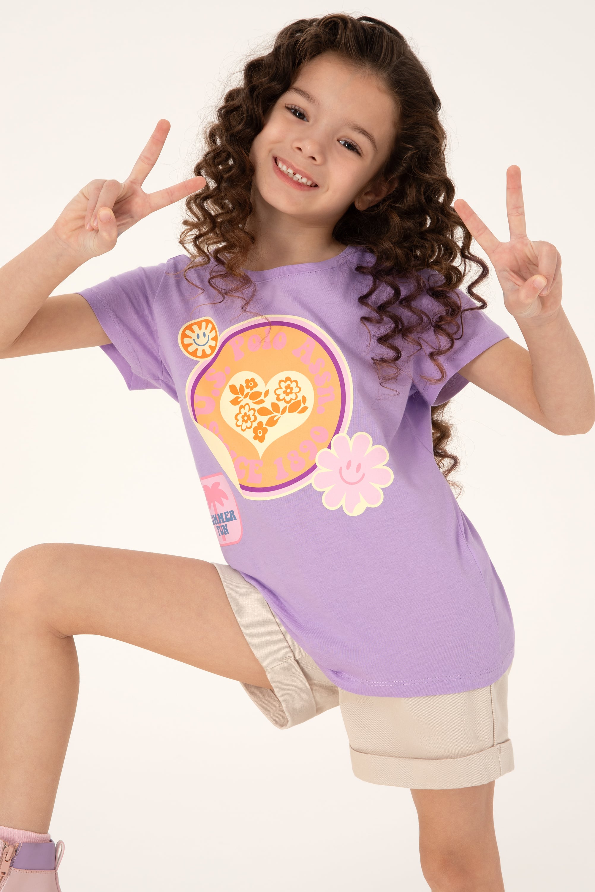 Kız Çocuk Lila Bisiklet Yaka Baskılı Pamuk Tişört