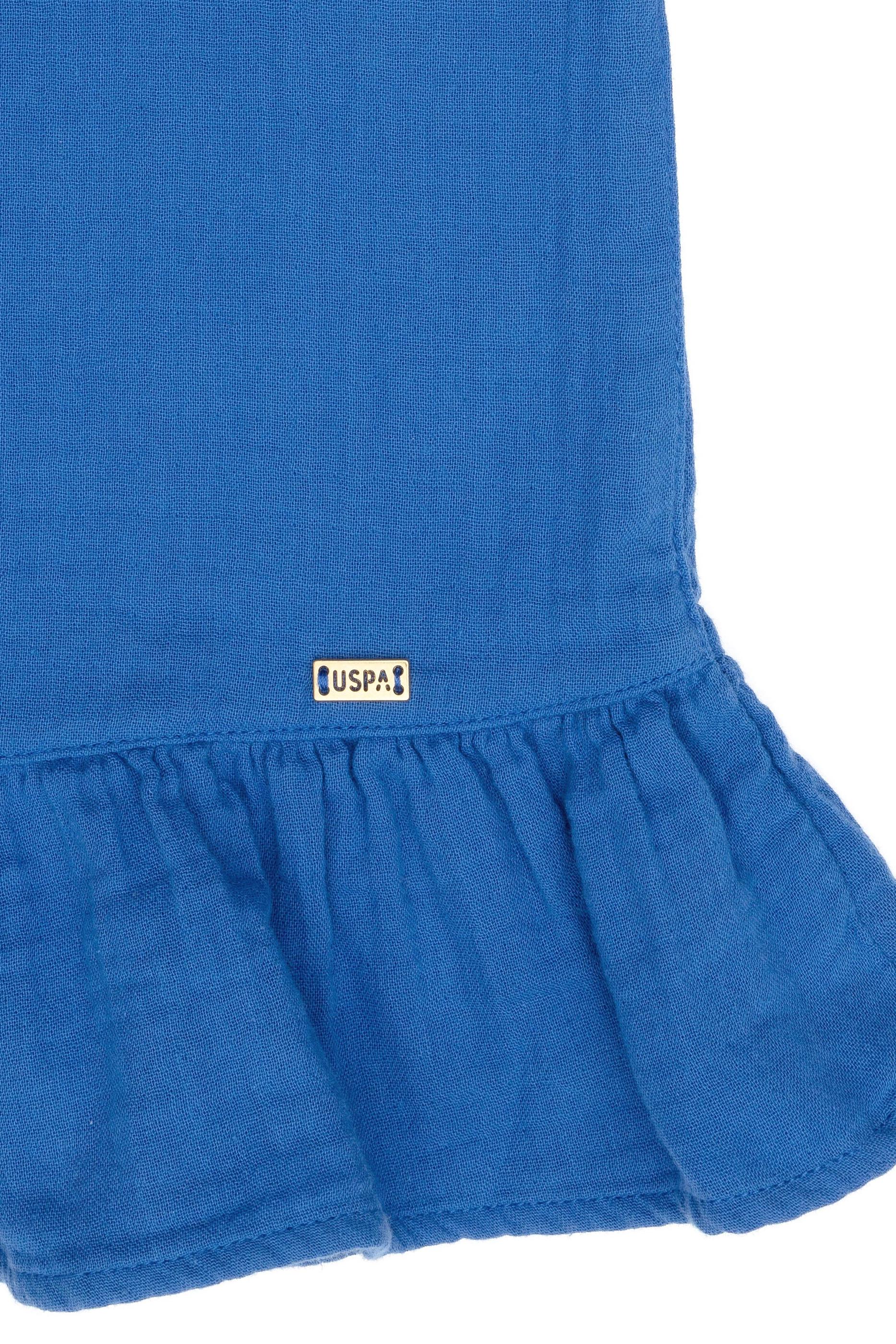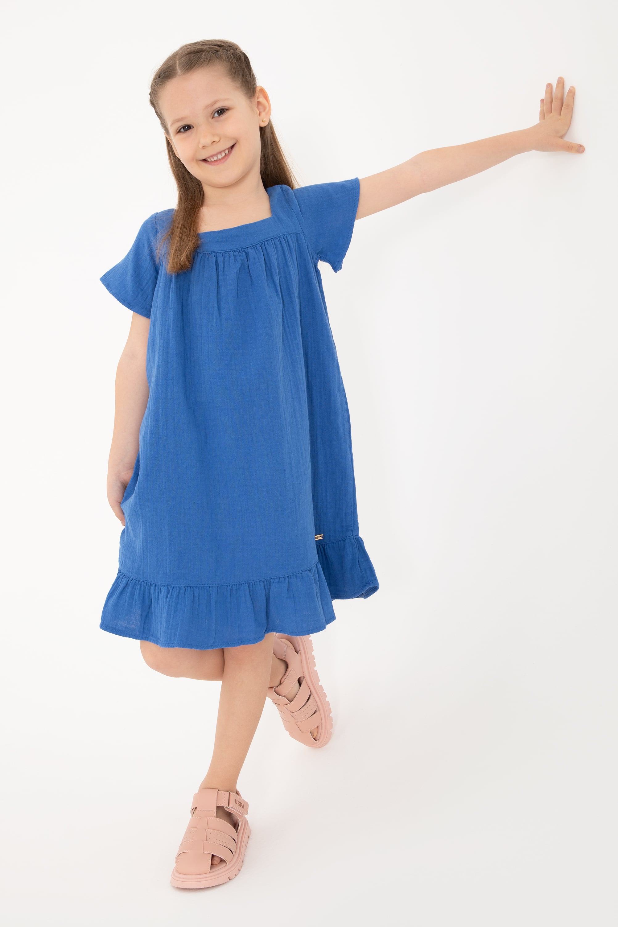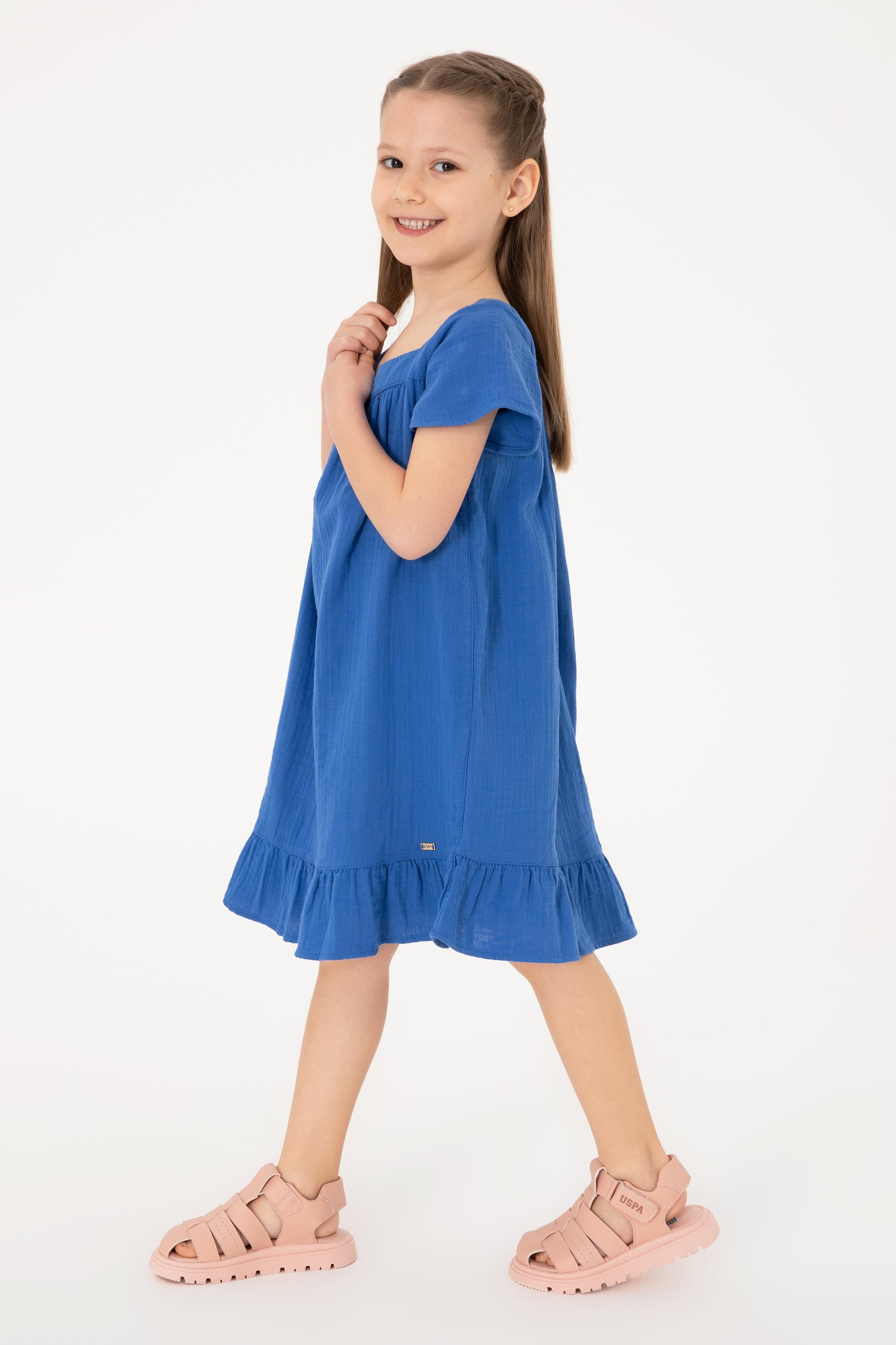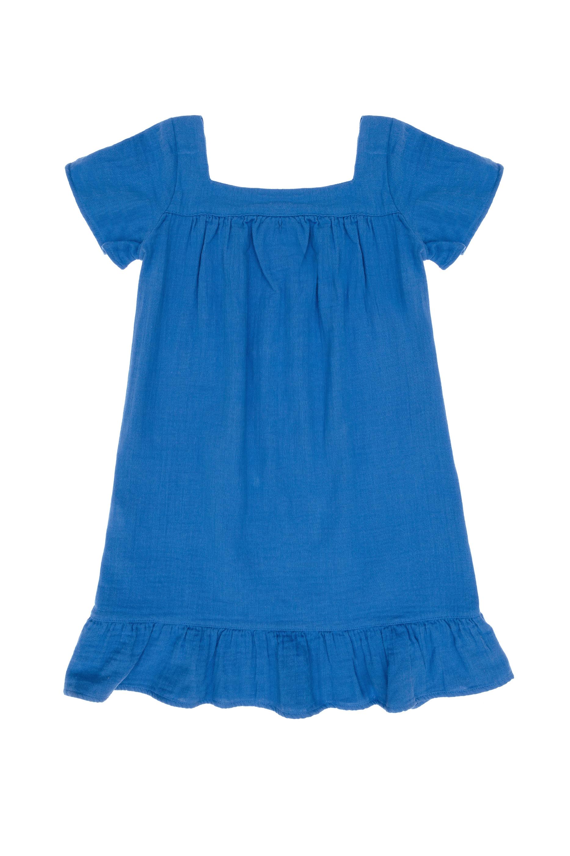 - Kız Çocuk Mavi Kısa Kol Müslin Kumaş Dokuma Elbise