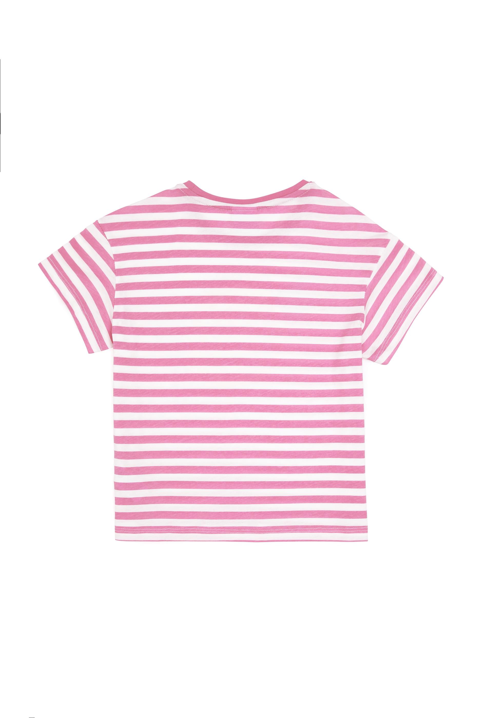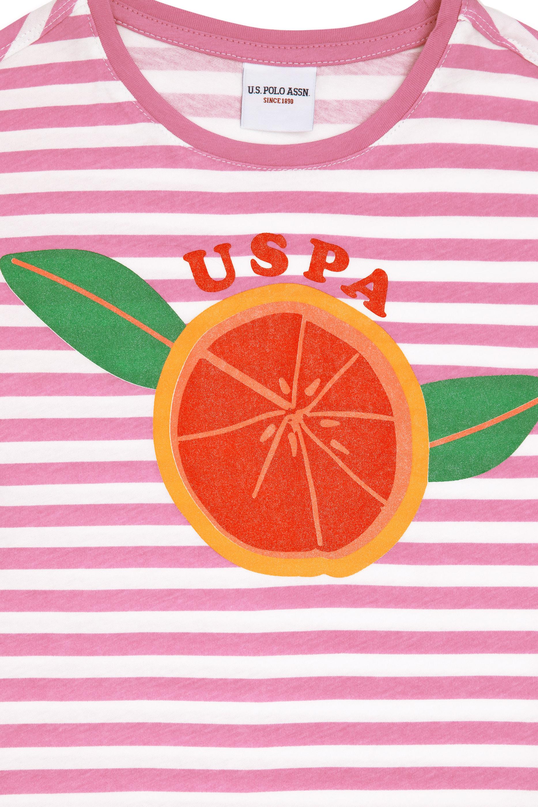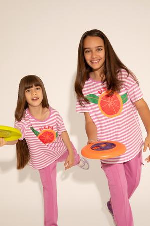 Menekşe renginin neşesiyle tasarlanan bisiklet yaka tişört, kız çocuklarının gardırobuna eğlenceli bir dokunuş katmaktadır. Çizgili desenlerin enerjik görünümü, yaz aylarının cıvıl cıvıl ruhunu yansıtırken, göğüs kısmındaki büyük portakal baskısı tişörte canlılık ve hareket katmaktadır. Yumuşak dokulu kumaşı, hassas ciltlere uygun bir konfor sunarak gün boyu rahatlık sağlamaktadır. Bisiklet yaka tasarımı, boyun çevresine tam oturmakta ve ekstra konfor sağlamaktadır.