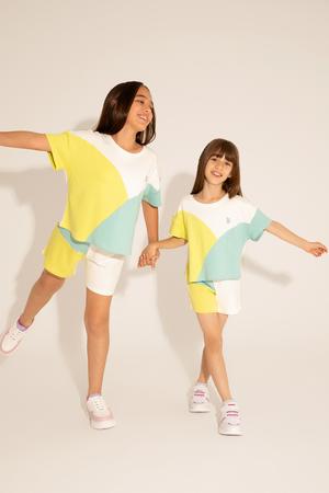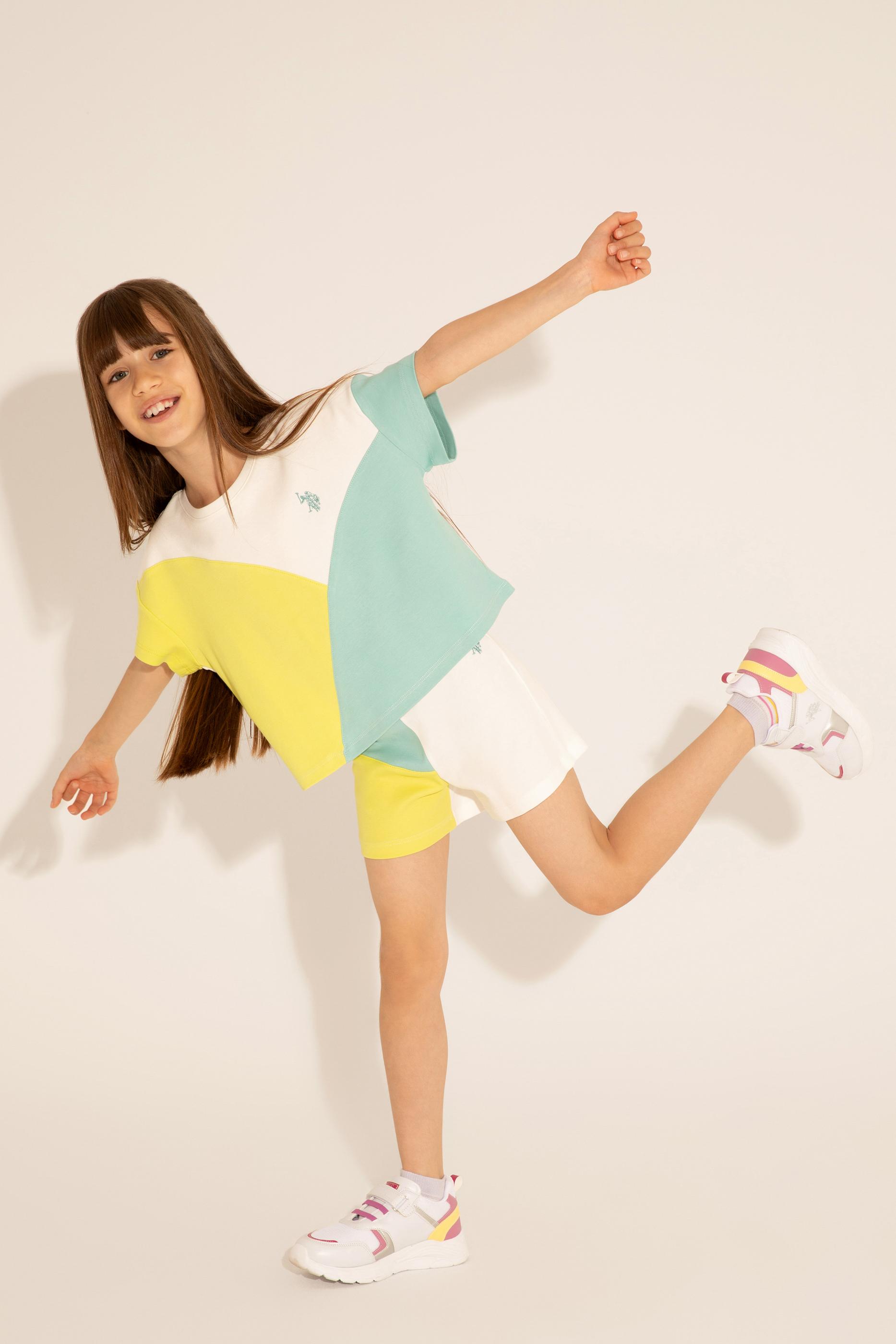 Mint renkli kız çocuk örme şort enerjik tasarımı ve canlı renk bloklarıyla dikkat çekiyor. Mint, sarı ve beyaz renklerin birleşimiyle oluşturulan şort, yazın neşesini yansıtan dinamik bir parçadır. Üzerinde bulunan küçük logo detayı, şortun sportif tarzını vurgularken aynı zamanda sade bir şıklık katıyor. Standart kesimi sayesinde rahat bir uyum sunan şort, çocukların gün boyu özgürce hareket etmelerine olanak tanır.