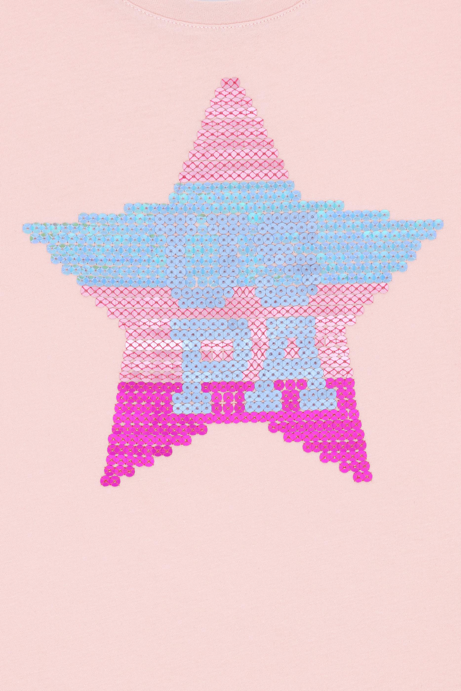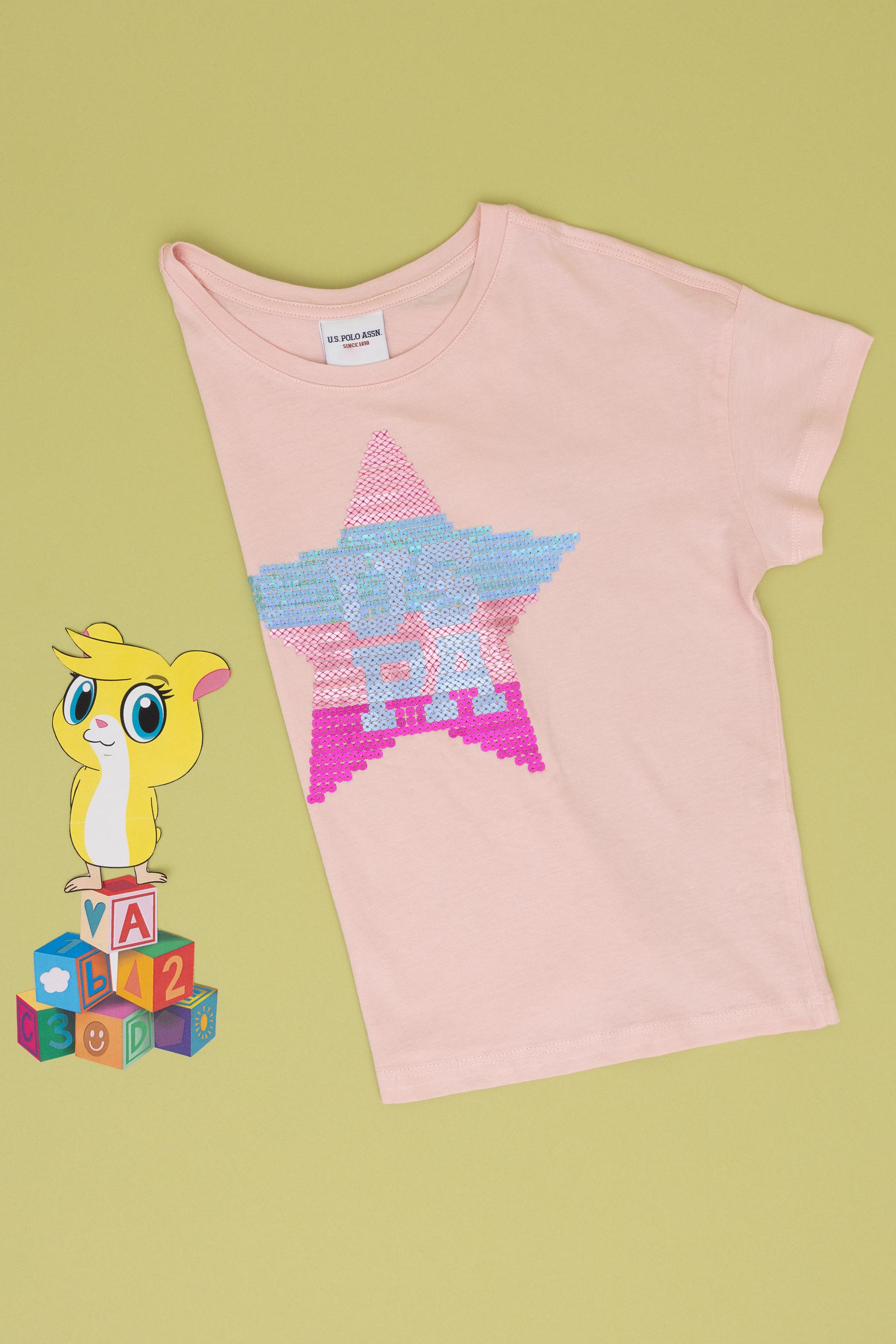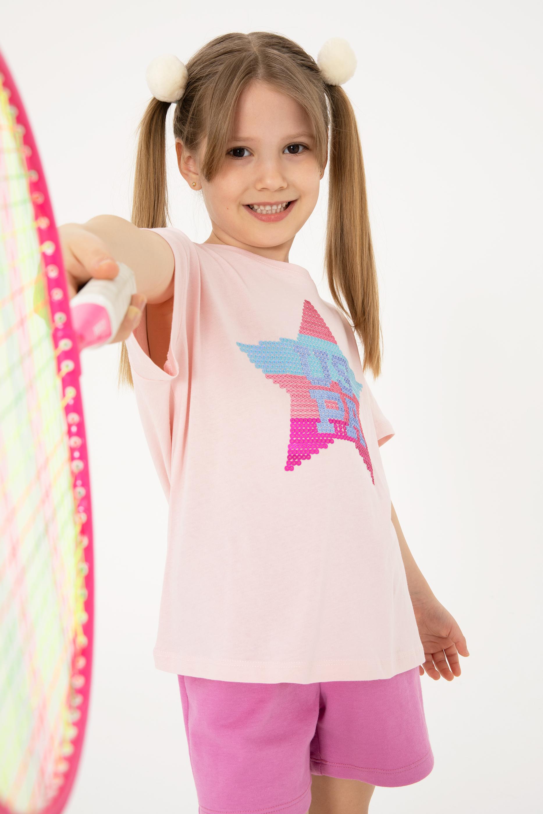 Kız Çocuk Pudra Bisiklet Yaka Pamuk Payet Yıldız Baskılı Tişört