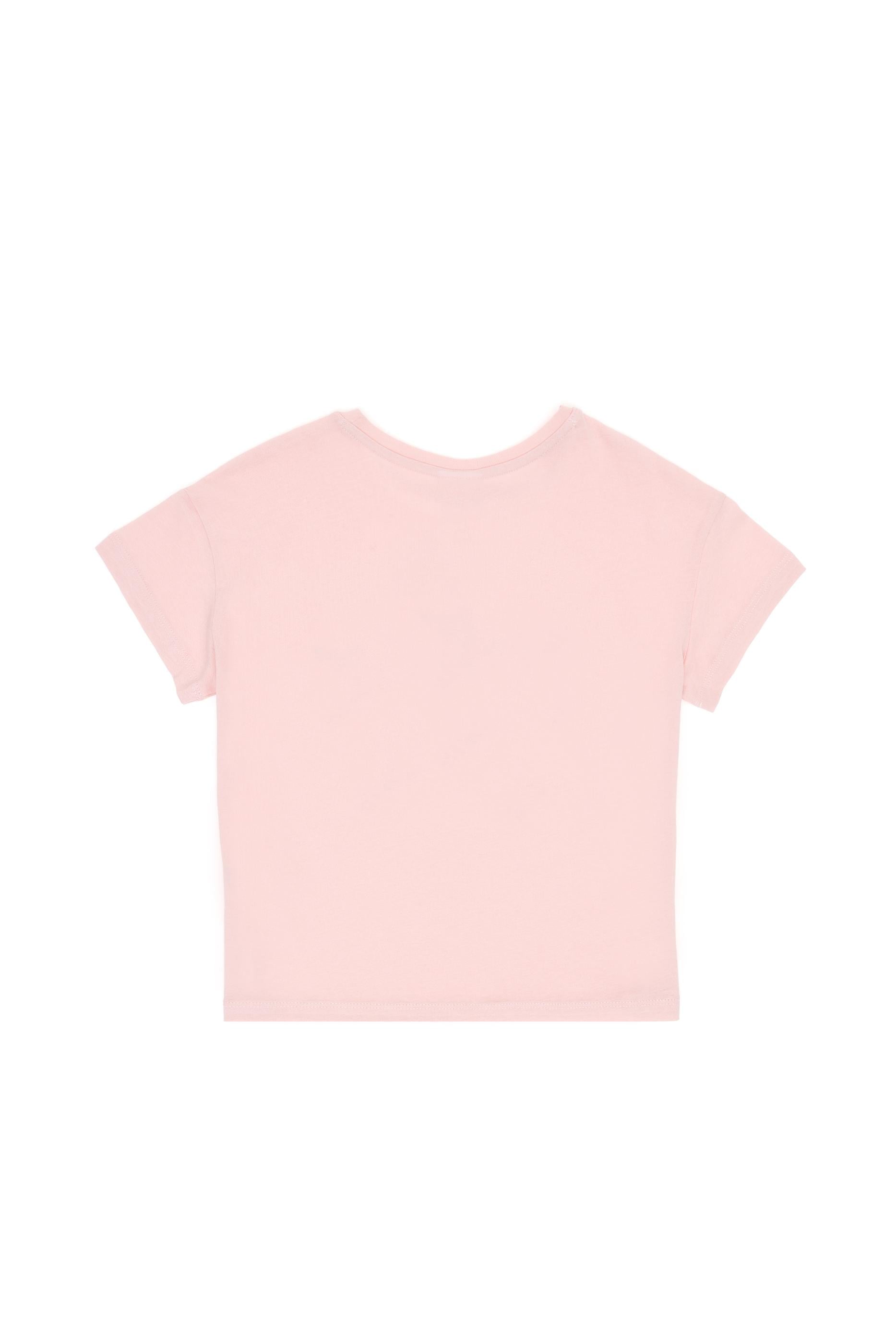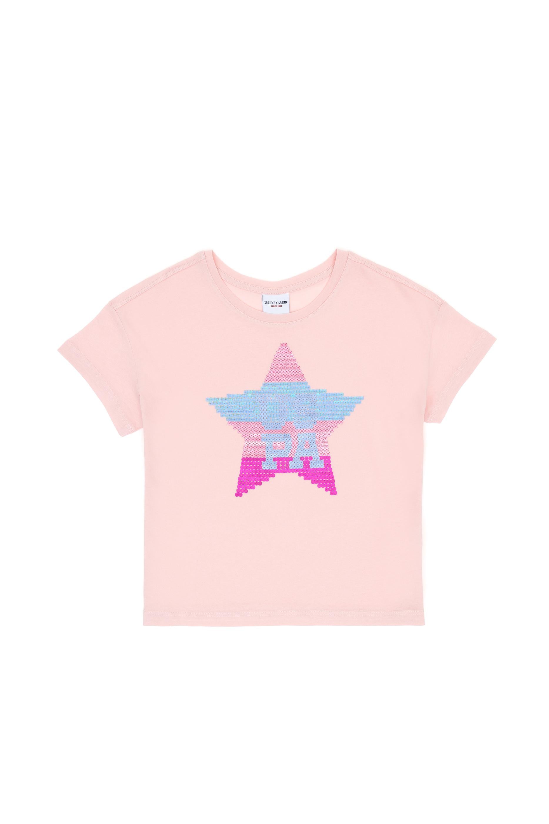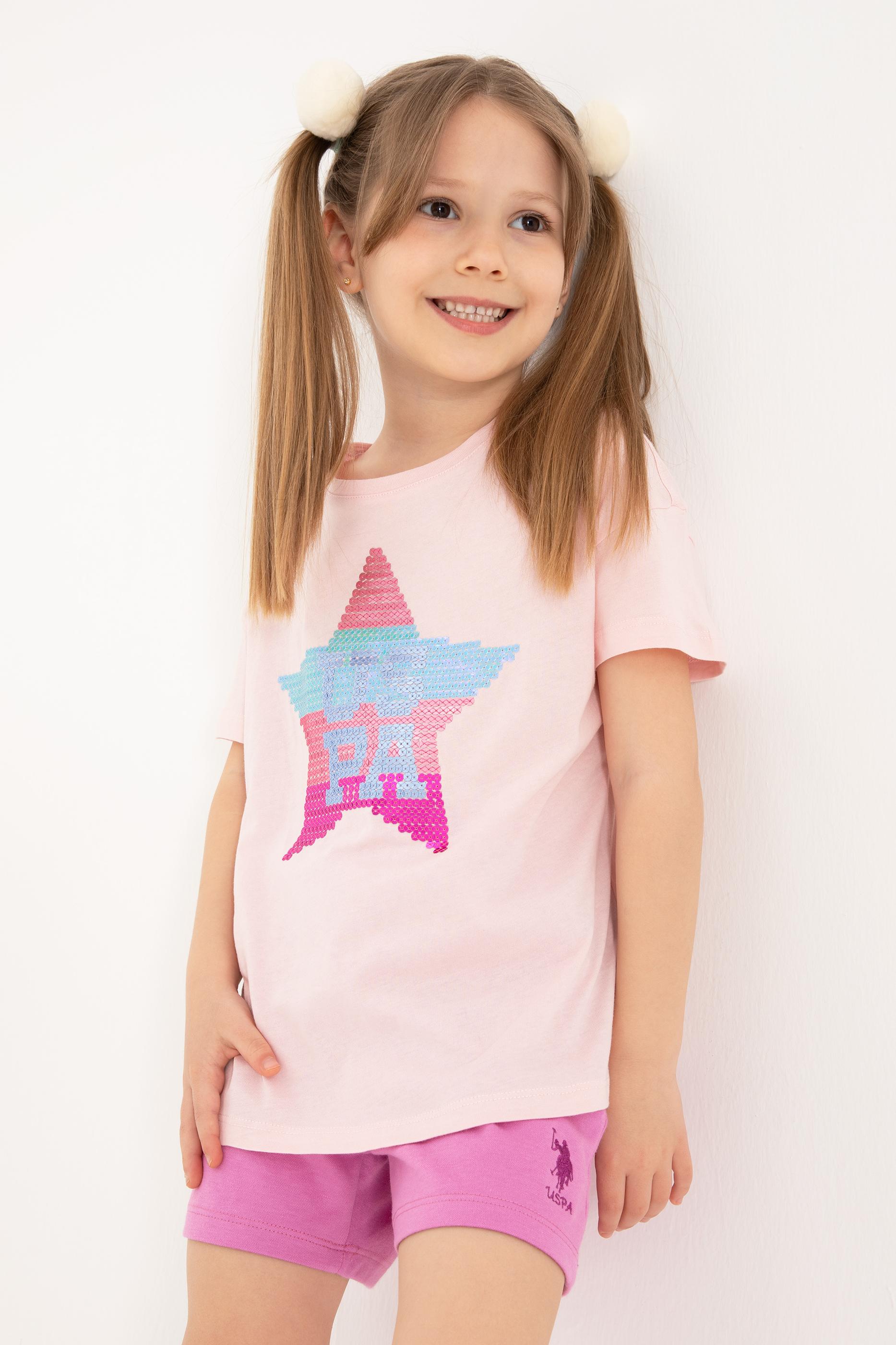 Kız Çocuk Pudra Bisiklet Yaka Pamuk Payet Yıldız Baskılı Tişört