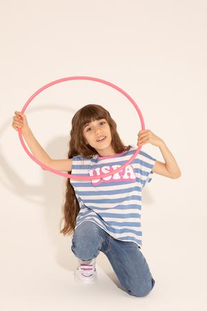 Koyu mavi rengi ve bisiklet yaka tasarımı ile dikkat çeken kız çocuk tişörtü, günlük yaşamda rahatlık arayan çocuklar için ideal bir tercih. Geniş ve regular fit kesimi sayesinde hareket özgürlüğü sunar, çocukların hareket kapasitelerini azaltmaz. Bu sayede özgürce koşup eğlenebilirler.