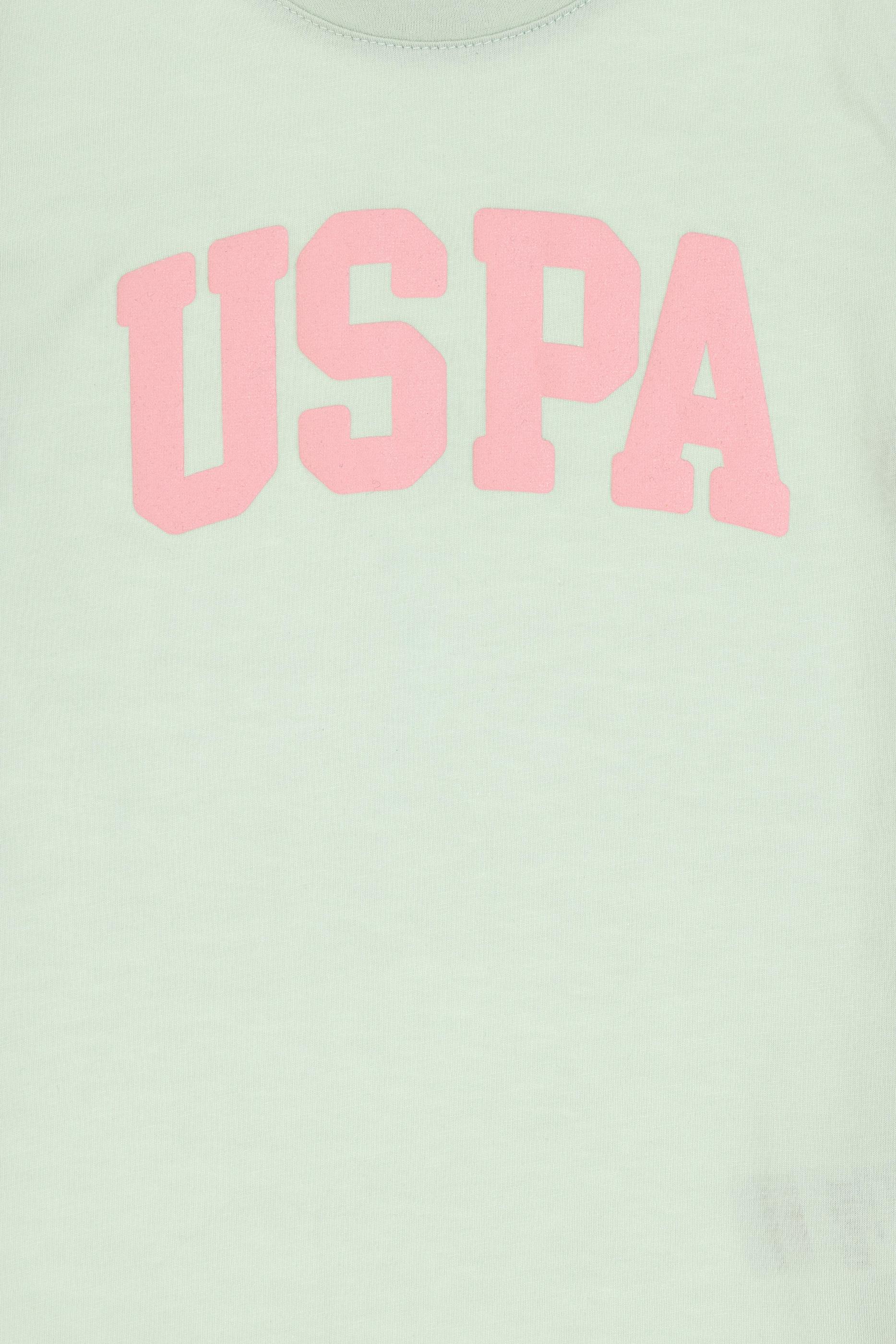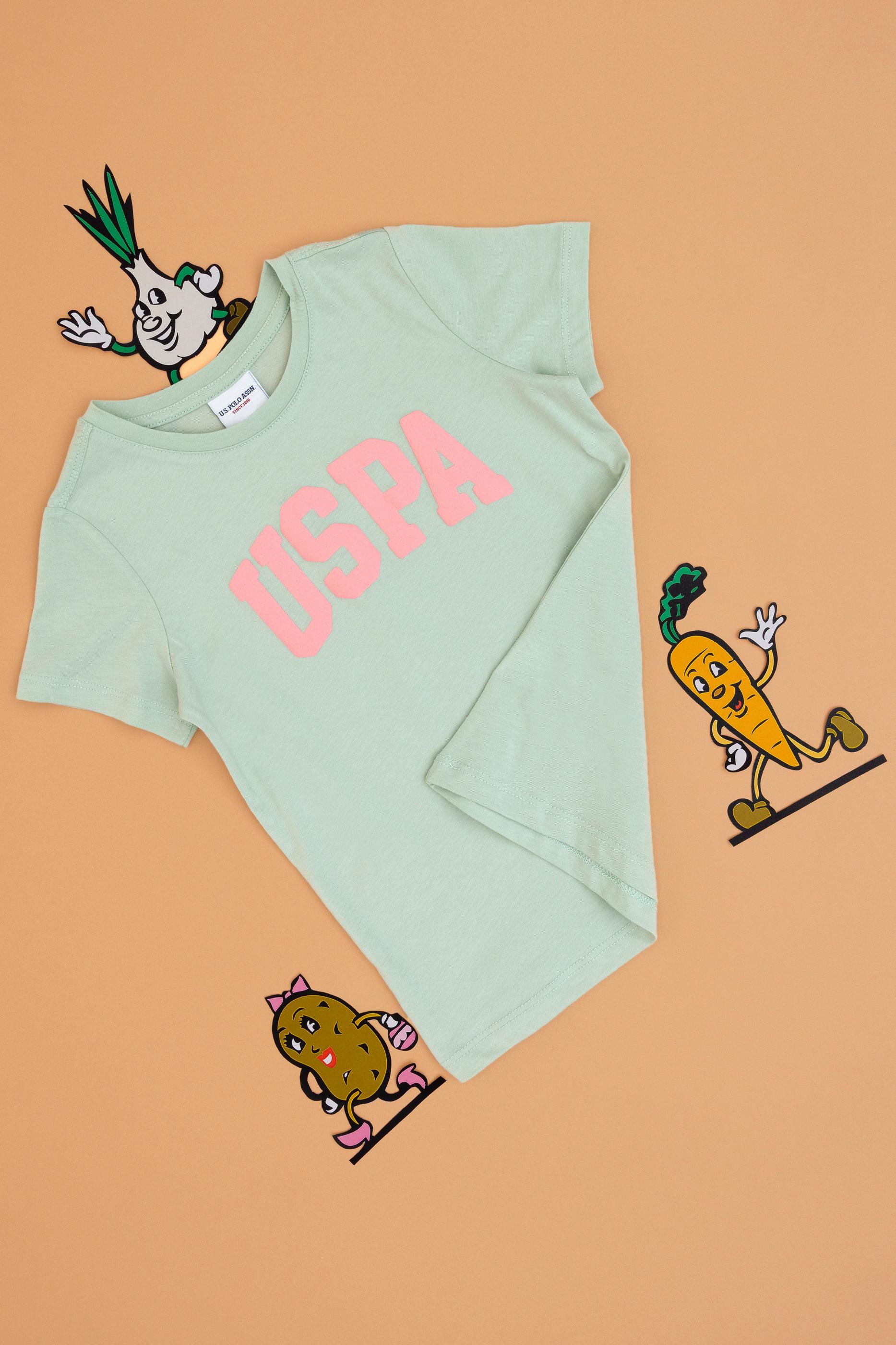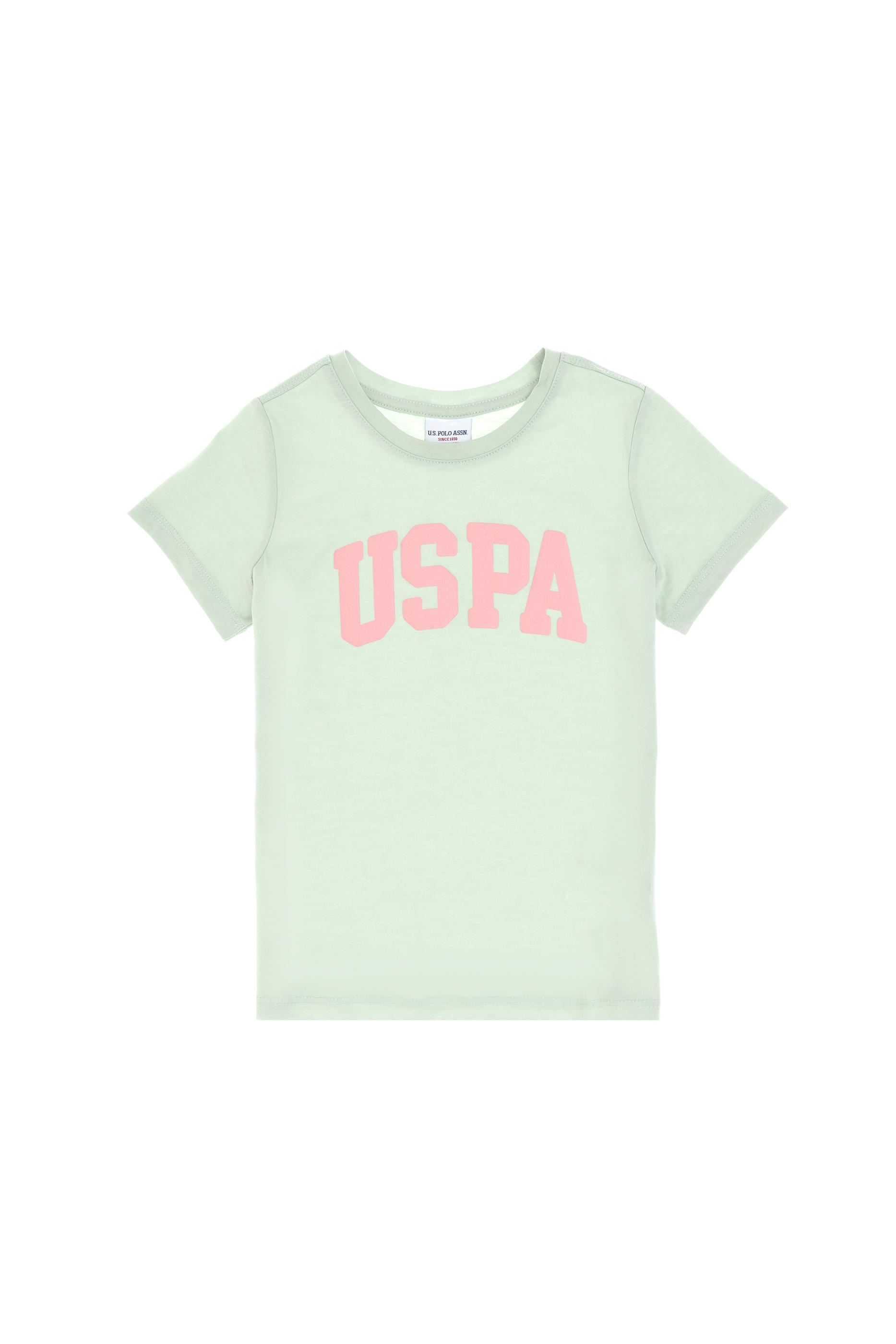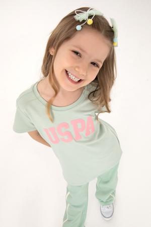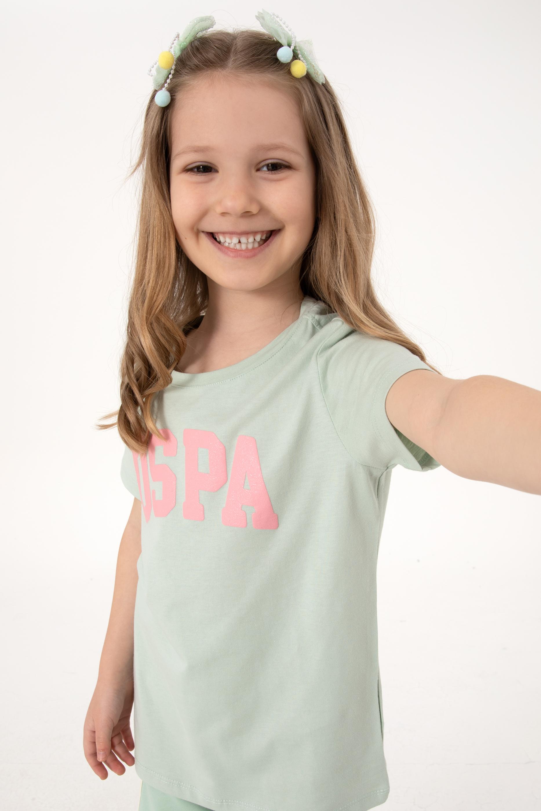 - Kız Çocuk Su Yeşili Bisiklet Yaka Pamuk Simli Uspa Baskılı Basic Tişört