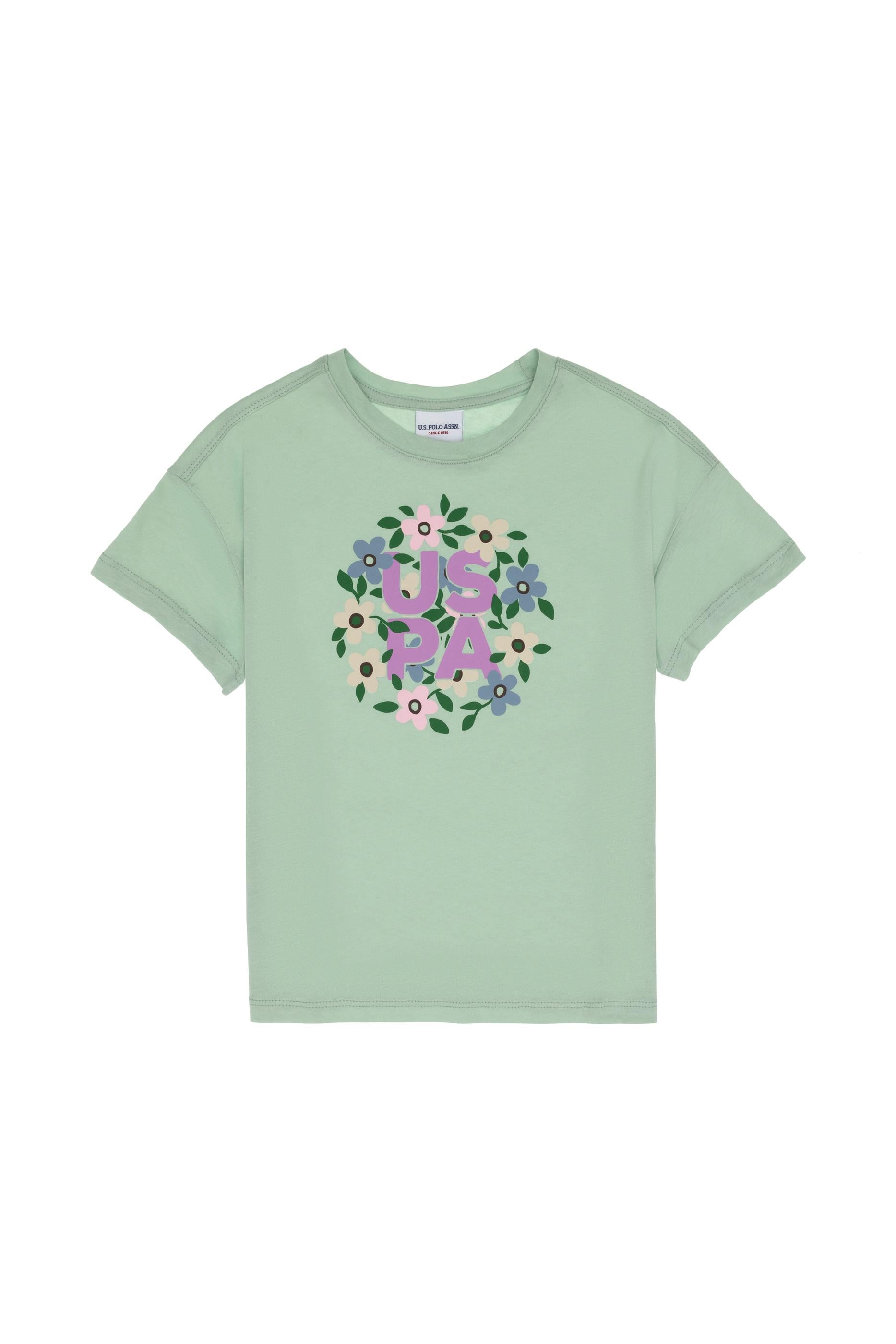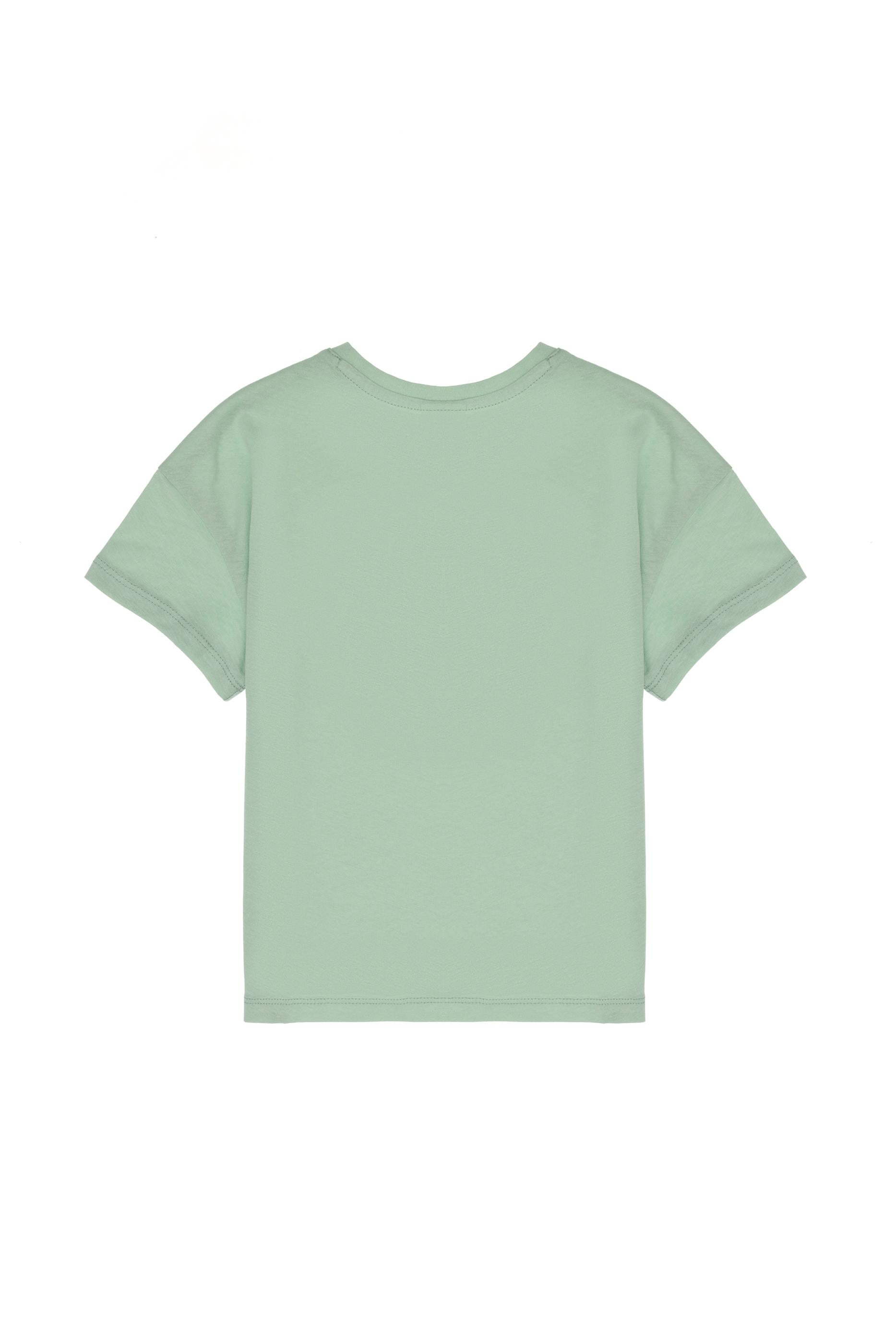 - Kız Çocuk Su Yeşili Bisiklet Yaka Çiçek Baskılı Pamuk Tişört
