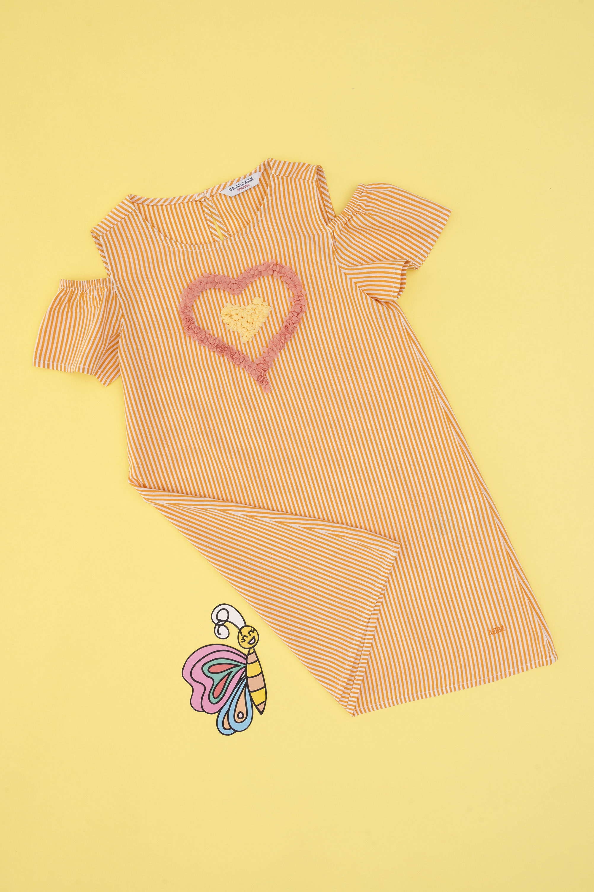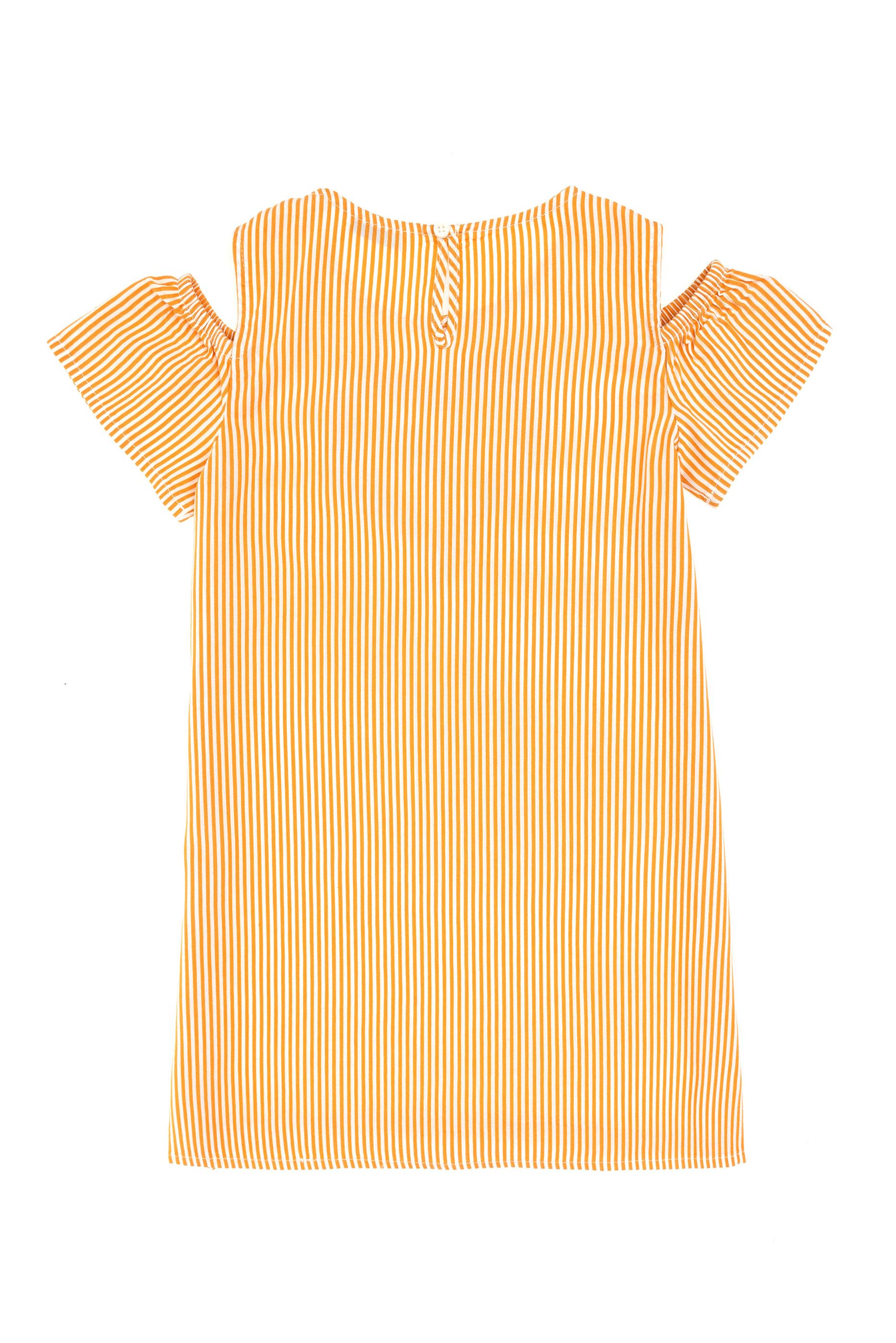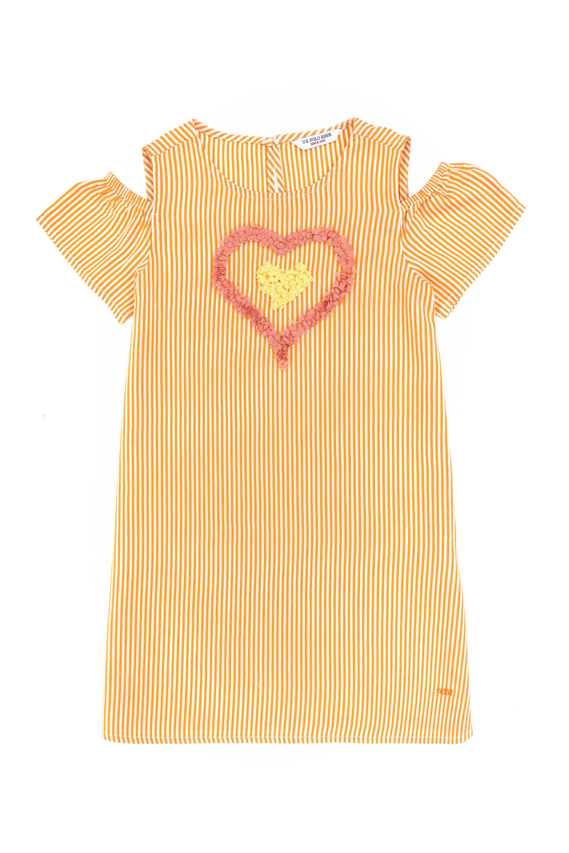Kız Çocuk Turuncu Kalp İşlemeli Çizgili Omuz Detaylı Dokuma Elbise
