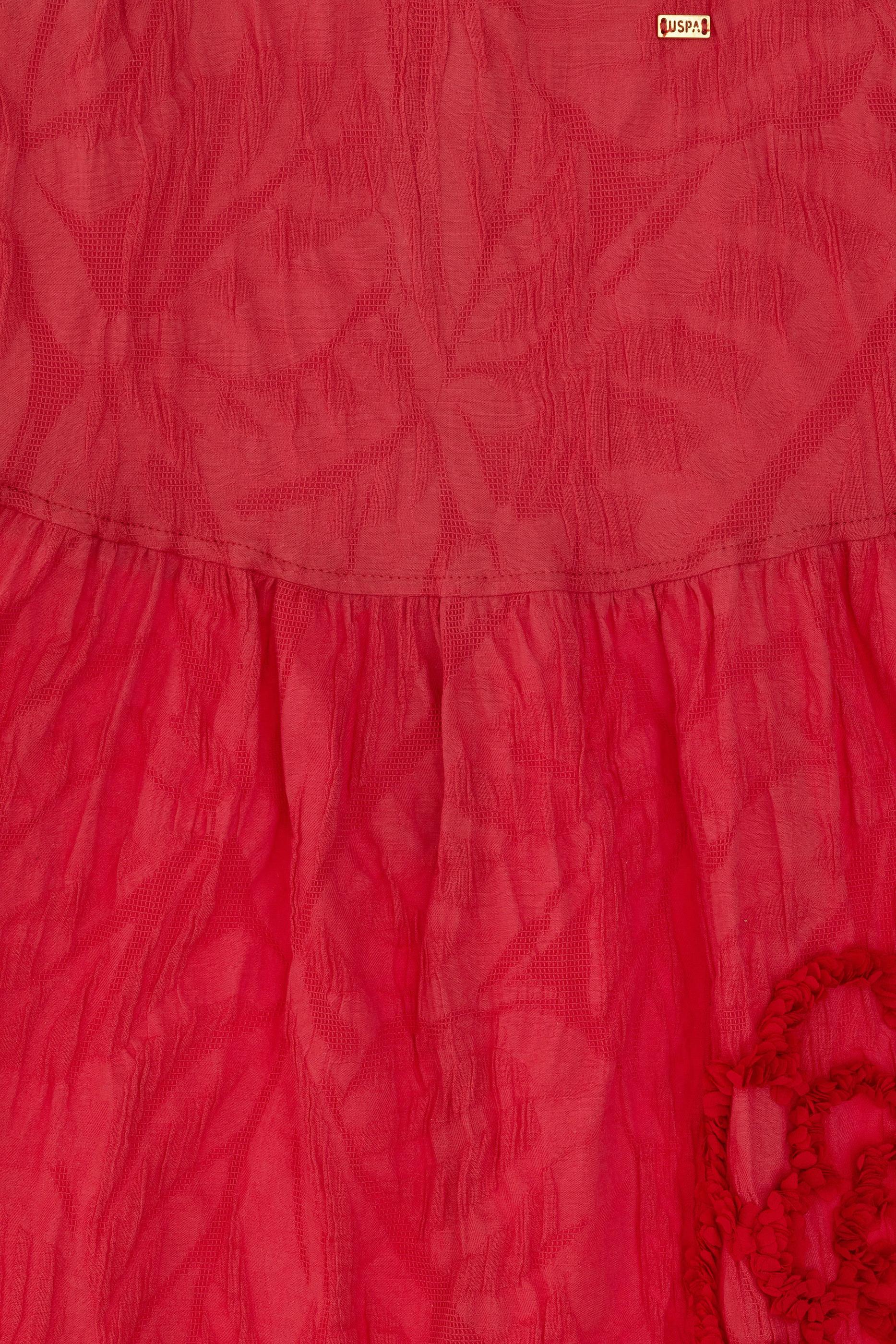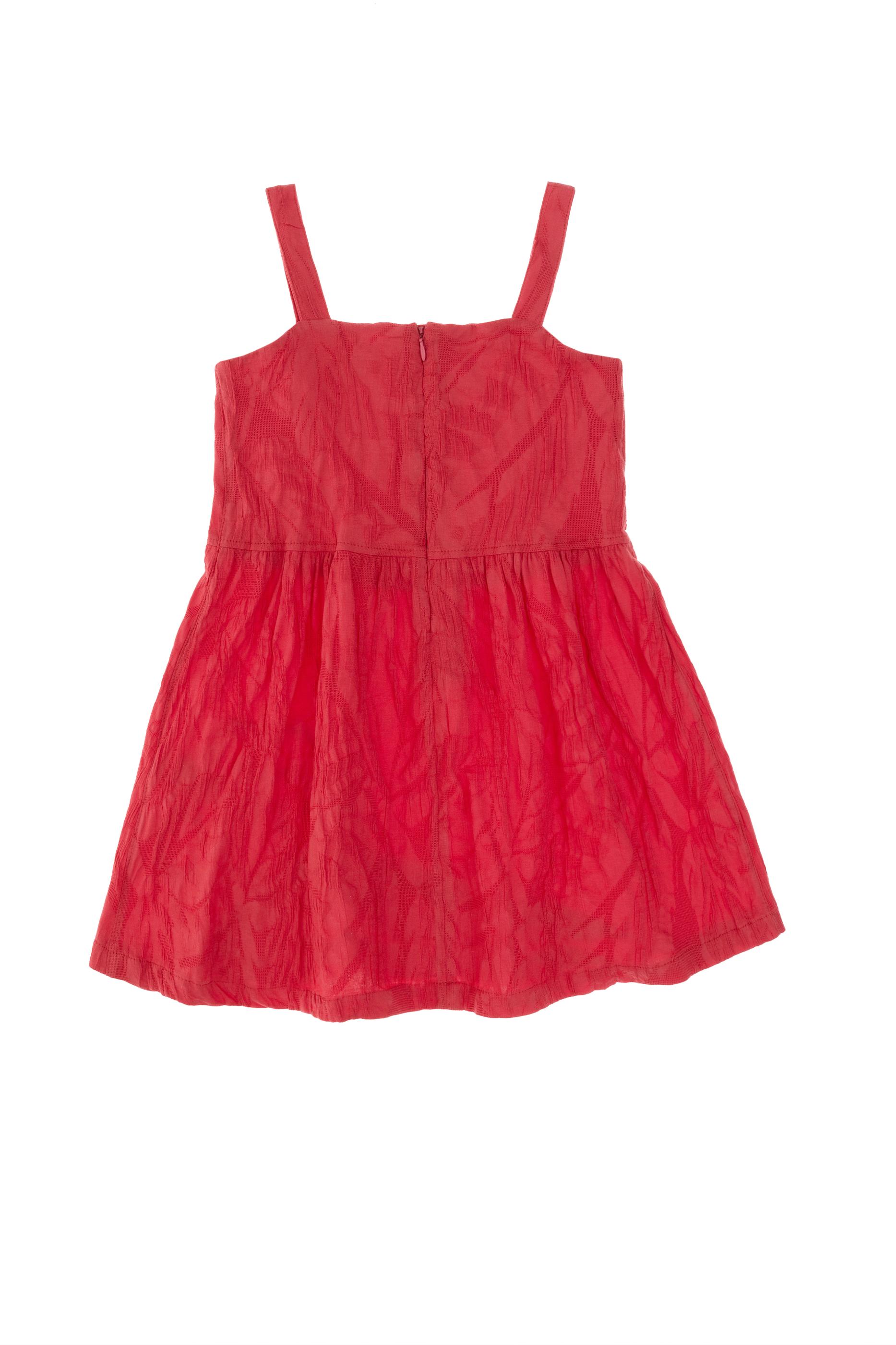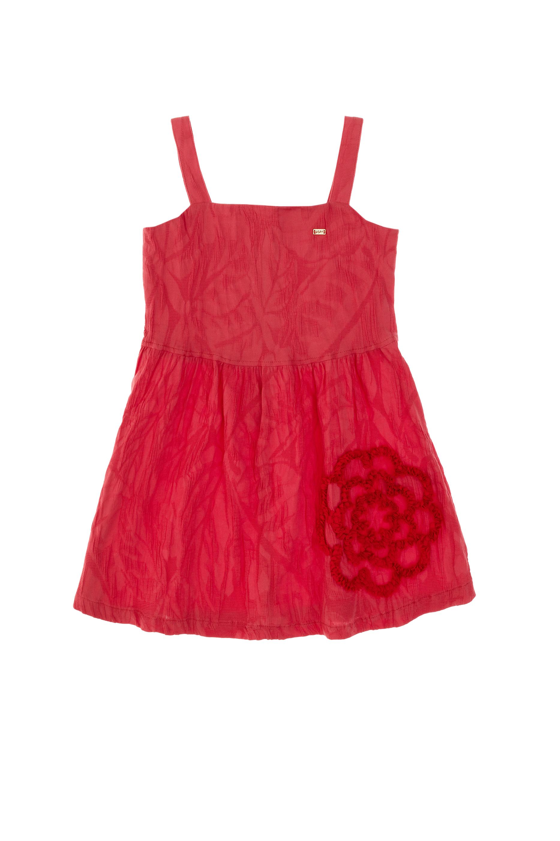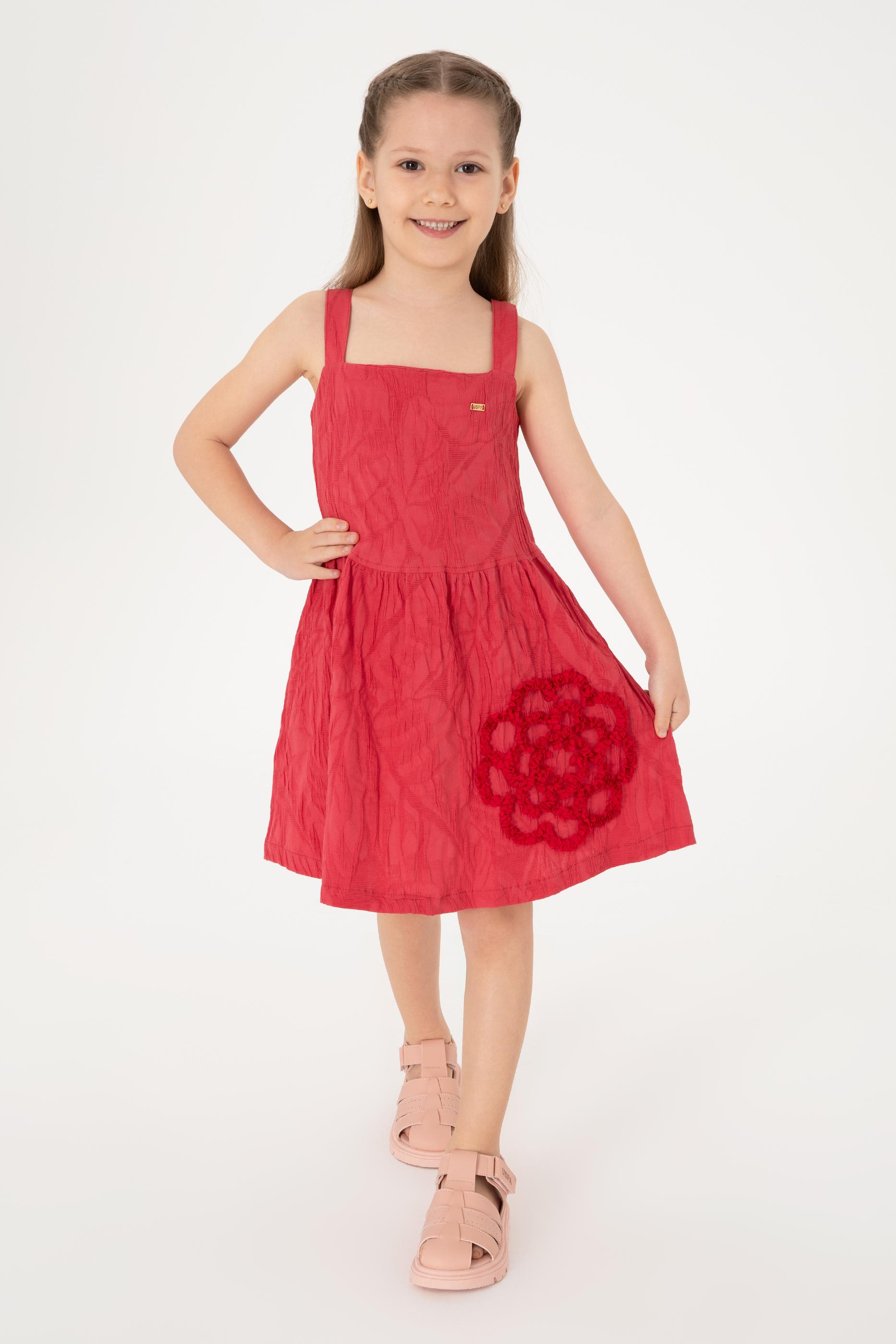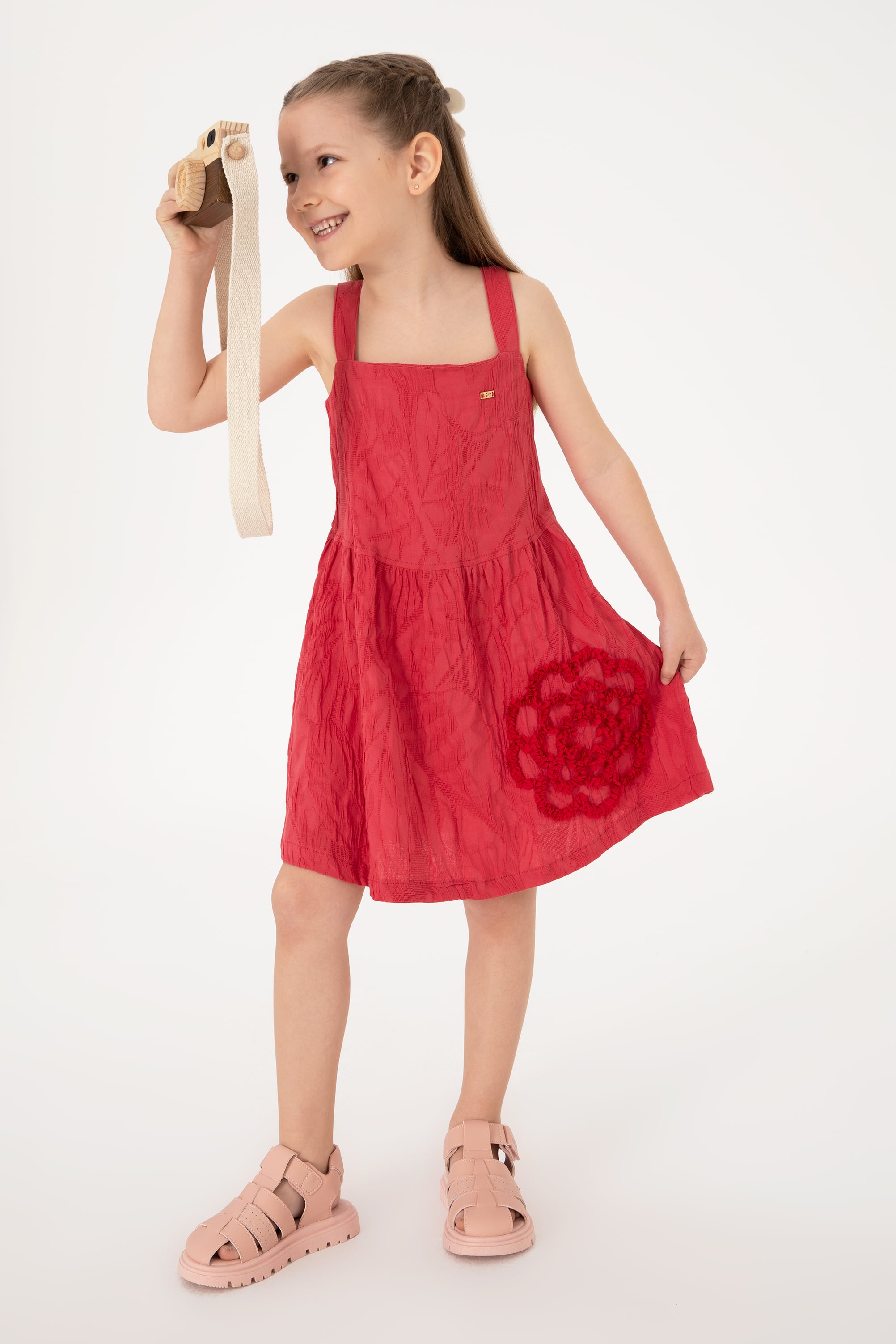 "name": "Kız Çocuk Vişne Askılı Çiçek İşlemeli Dokuma Elbise",